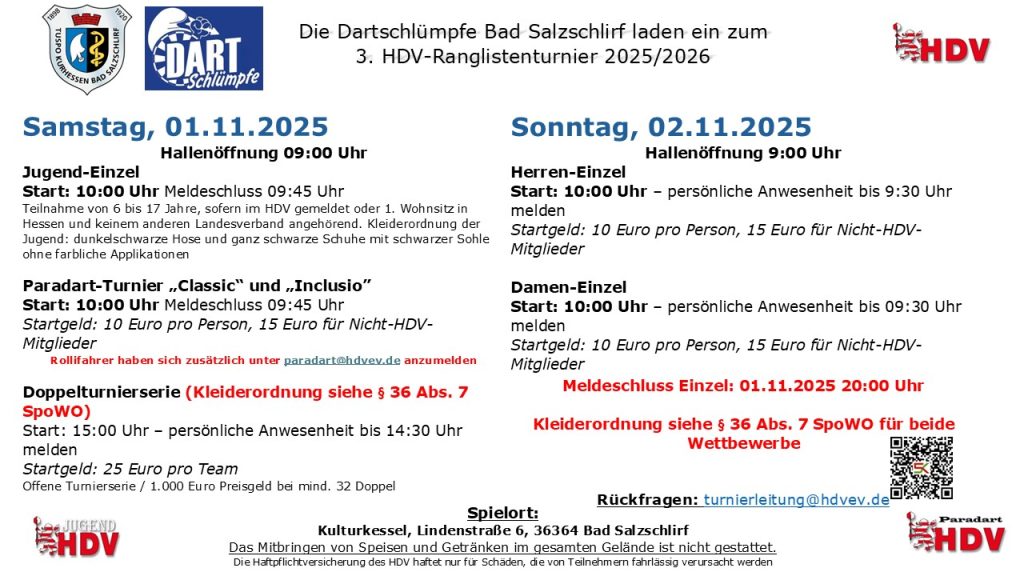 Der nächste Halt auf dem Weg zu den German Masters 2026 ist Bad Salzschlirf. Dort findet am 01. und 02. November 2025 das nächste Turnier statt, bei dem wertvolle Punkte für die Rangliste erspielt werden können. Die Dartschlümpfe Großenlüder freuen sich bereits jetzt auf viele motivierte Teilnehmende, die sich dorthin auf den Weg machen werden.