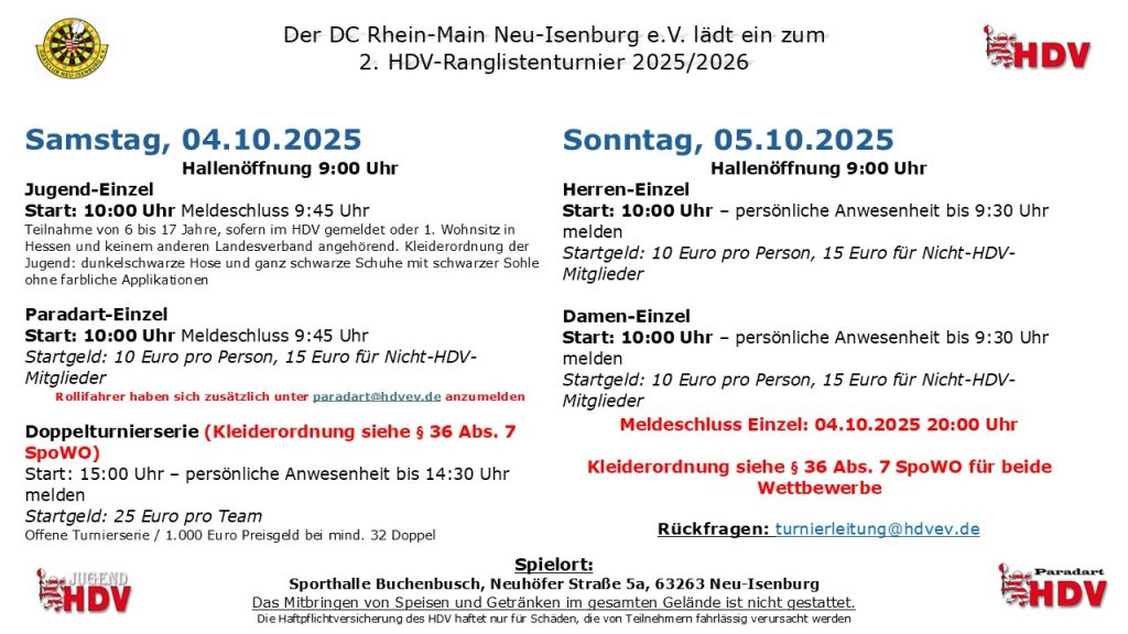 Hallo werte Turnierteilnehmer und Interessierte,  zur allgemeinen Information teilen wir bezüglich des HDV-RLT in Gießen und allen folgenden Turnieren